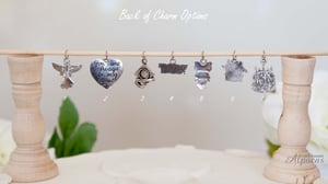 The charm is attached to a silver elastic string for easy removing if desired. There are 7 (seven) charm options to choose from. The 4th photo shows you the front of each charm. The 5th photo shows you the back of each charm.
